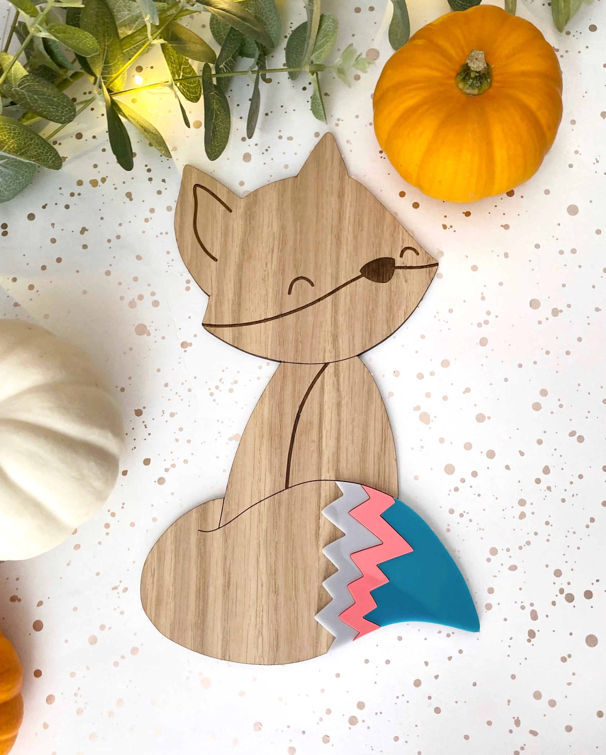 Felix is laser cut from oak veneered wood and his features have been laser engraved for a high quality and natural finish. His tail is cut from colourful acrylic in dove grey, coral and turquoise. This unique colour combination is modern and perfect for Autumn.