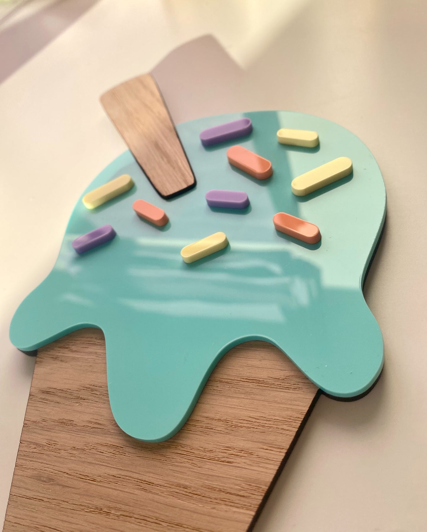 It is made from oak veneered wood with a choice of mint green, pink or lilac acrylic for the ice cream and multicoloured sprinkles which will add fun to any room.