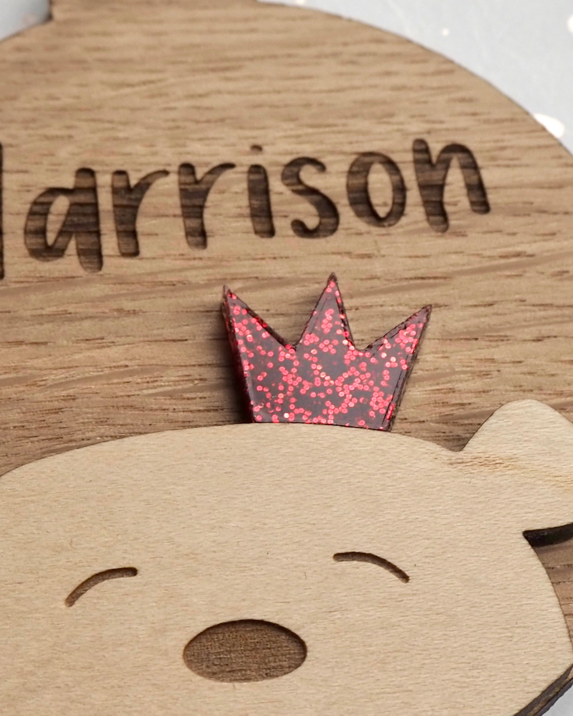 The maple wood bear and his sparkly glitter crown are both mounted on to the oak decoration which makes him really stand out and creates a luxury, high quality finish. You can choose from gold, silver or red sparkle for the crown which is made from beautiful glitter acrylic.