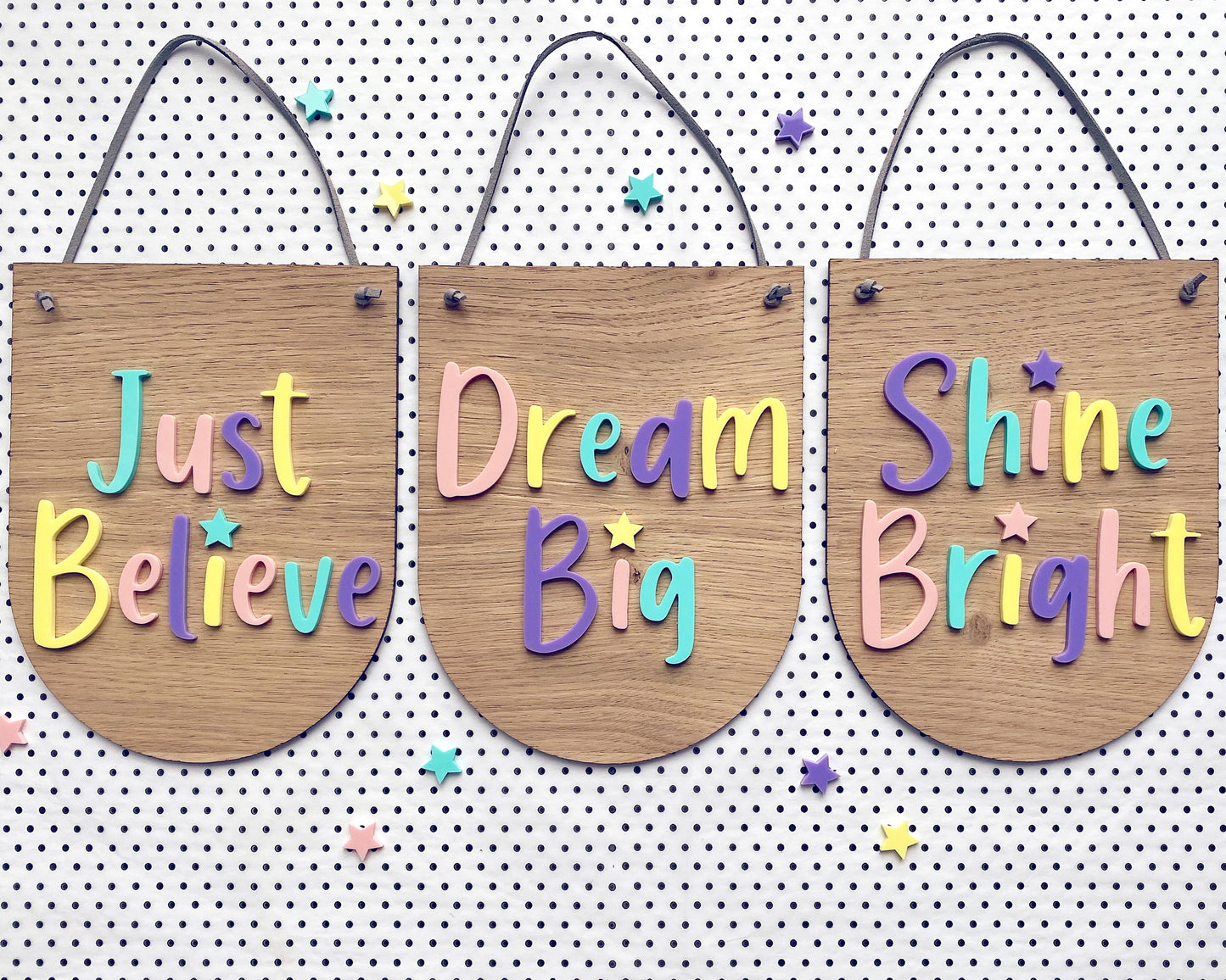 This plaque is a fun and stylish addition to the wall of any child's bedroom. The bright pastel lettering against the natural wood is modern and playful and is a positive reminder to always Shine Bright!