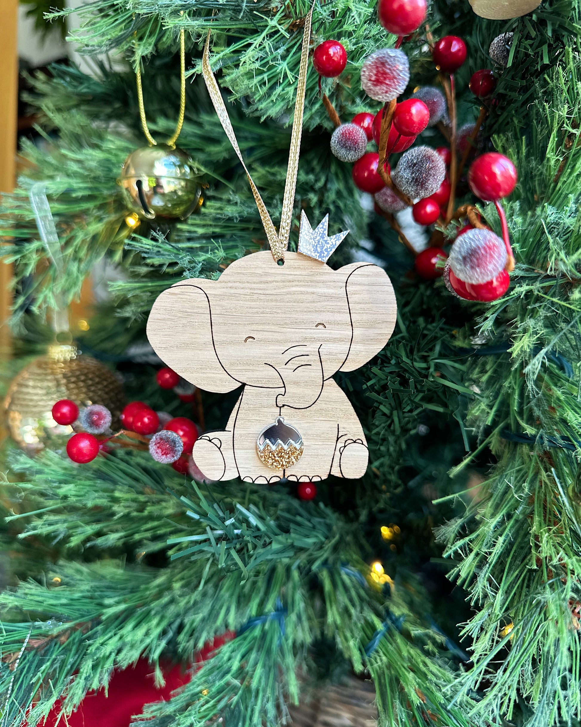 The elephant measures 8.5cm tall by 8cm wide and hangs from gold sparkly ribbon and a gold glitter crown.